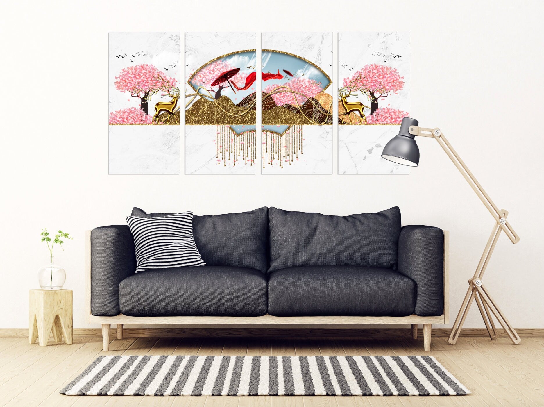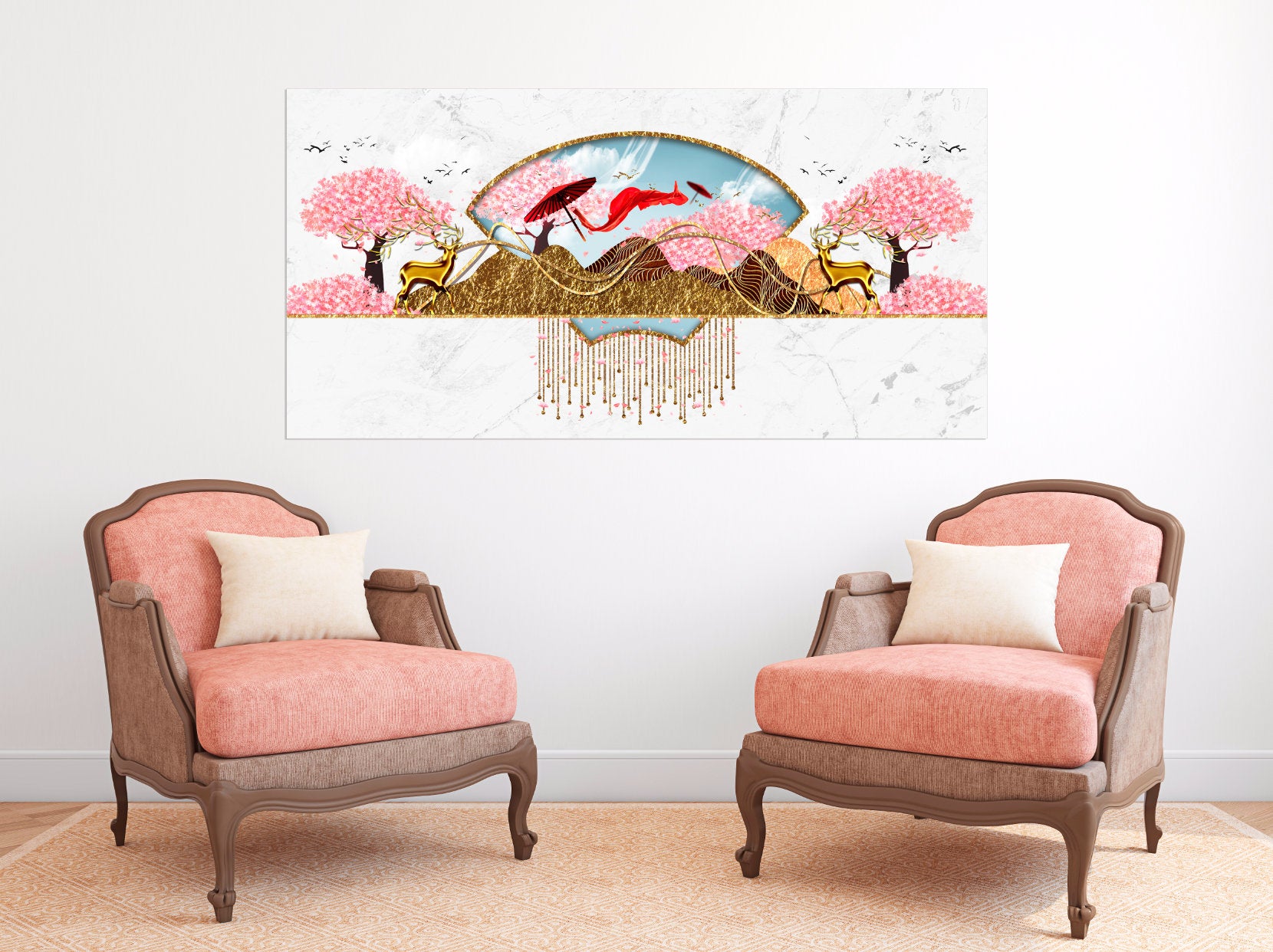 Sakura Blüten Japanische Wandkunst Leinwandgemälde Home Wanddekoration 3-teiliger Rahmen Leinwand Felsen und Berge Asiatische Wandkunst Goldener Hirsch