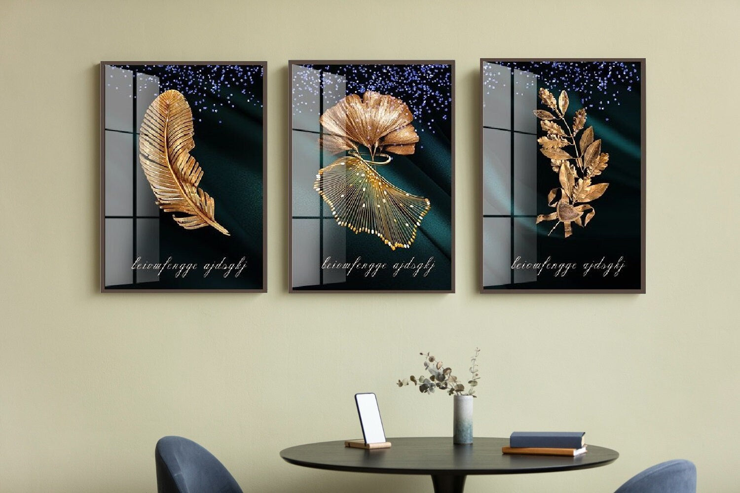 3er-Set botanische Wanddrucke, Leinwandkunst mit goldenen Pflanzen im schwebenden Rahmen, modische Wandkunst auf Leinwand in Gold, gerahmte druckbare Kunstwerke mit goldenen Blättern