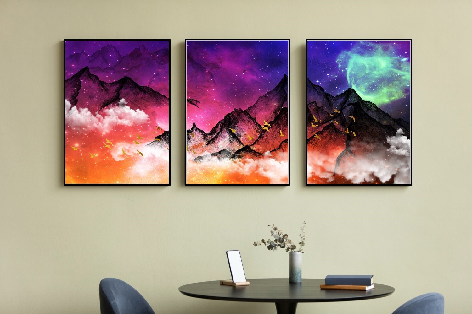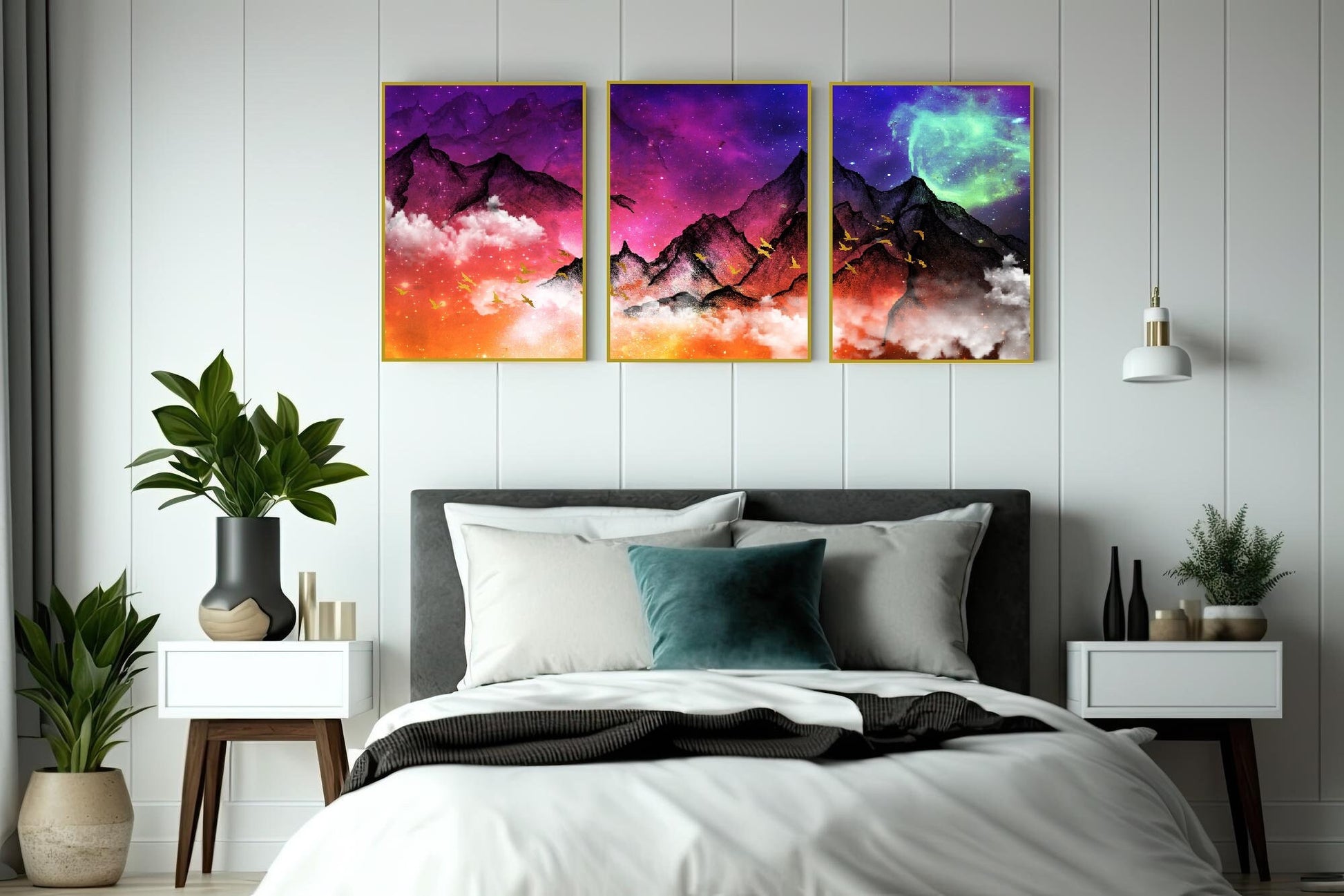 3er-Set farbenfrohe Natur-Wandbilder im Floater-Rahmen, extra großes gerahmtes Landschaftsbild, Berge-Wandbild, moderner Leinwanddruck fürs Wohnzimmer