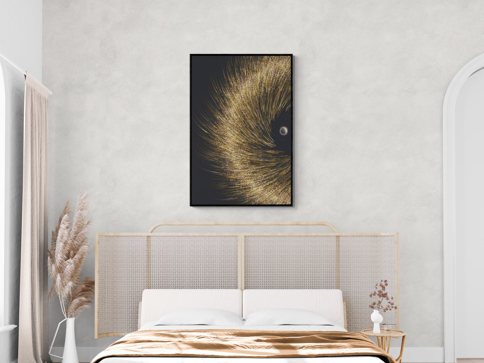 Abstraktes Sonnensystem Wandkunst, gerahmter gold-schwarzer Kunstdruck, gerahmter zeitgenössischer Leinwanddruck, moderne Wandkunst, Schlafzimmerkunst, Geschenk für den Chef