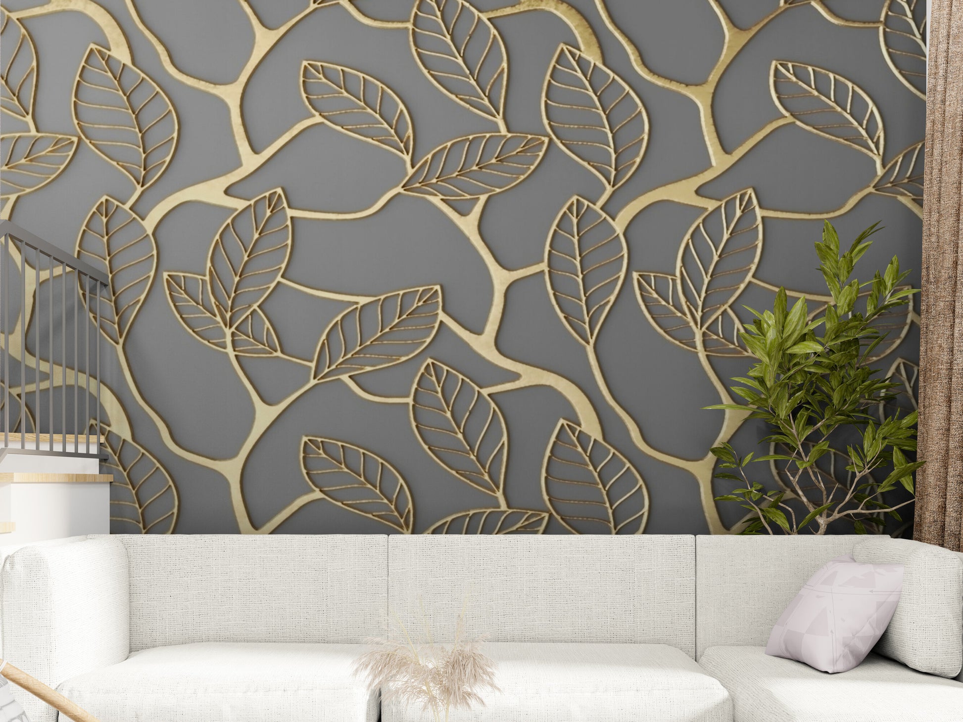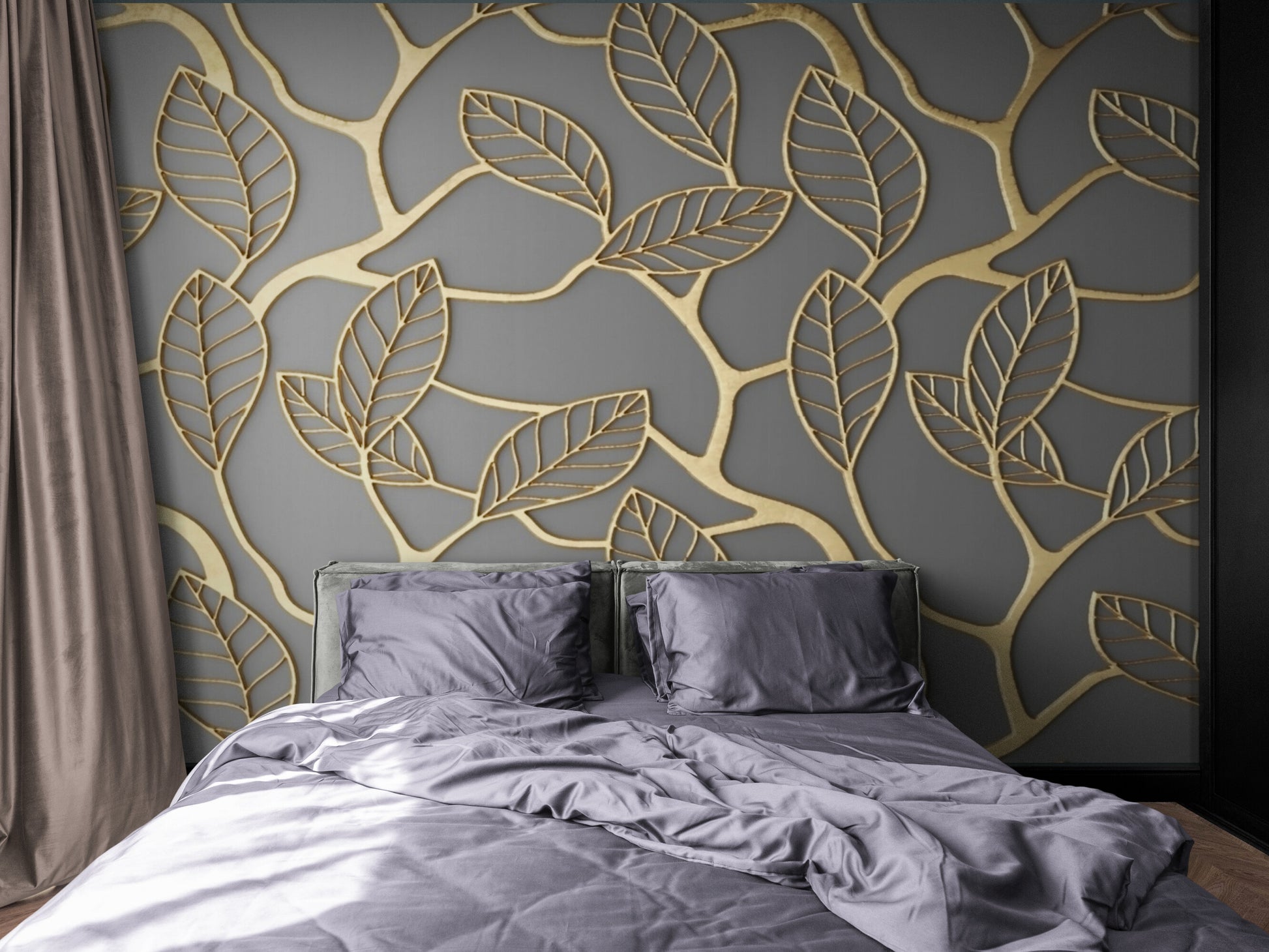 Wandbild mit goldenen Blättern, abstrakte Tapete in Grau und Gold, botanisches Wandbild zum Abziehen und Aufkleben, abnehmbare Tapete, selbstklebendes Wandbild für Schlafzimmer